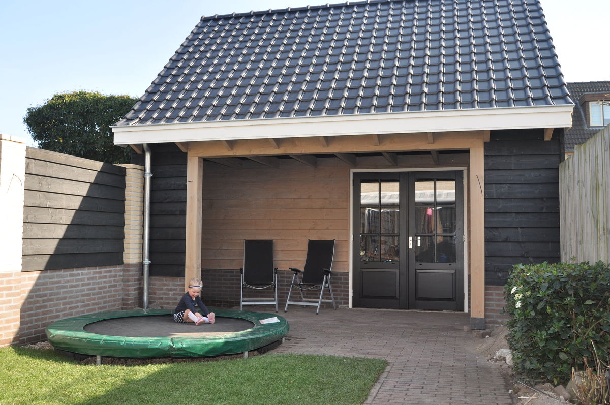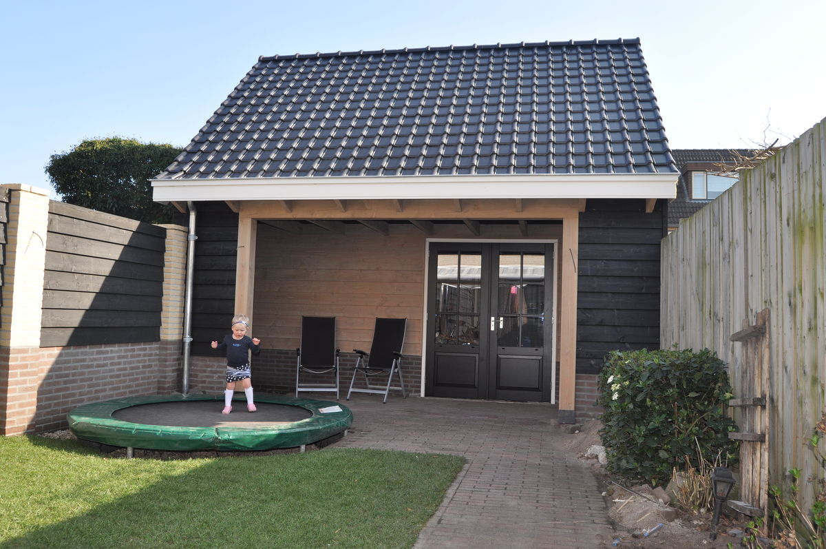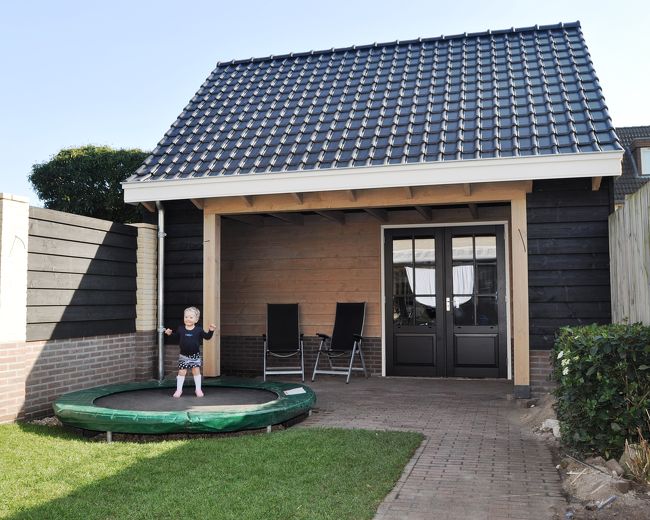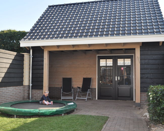 Een berging met veel ruimte, doordat de kap een stijle dakhelling heeft, is er enorm veel ruimte in deze berging. Met een overkapping er aan vast, kan het hele jaar door worden genoten.