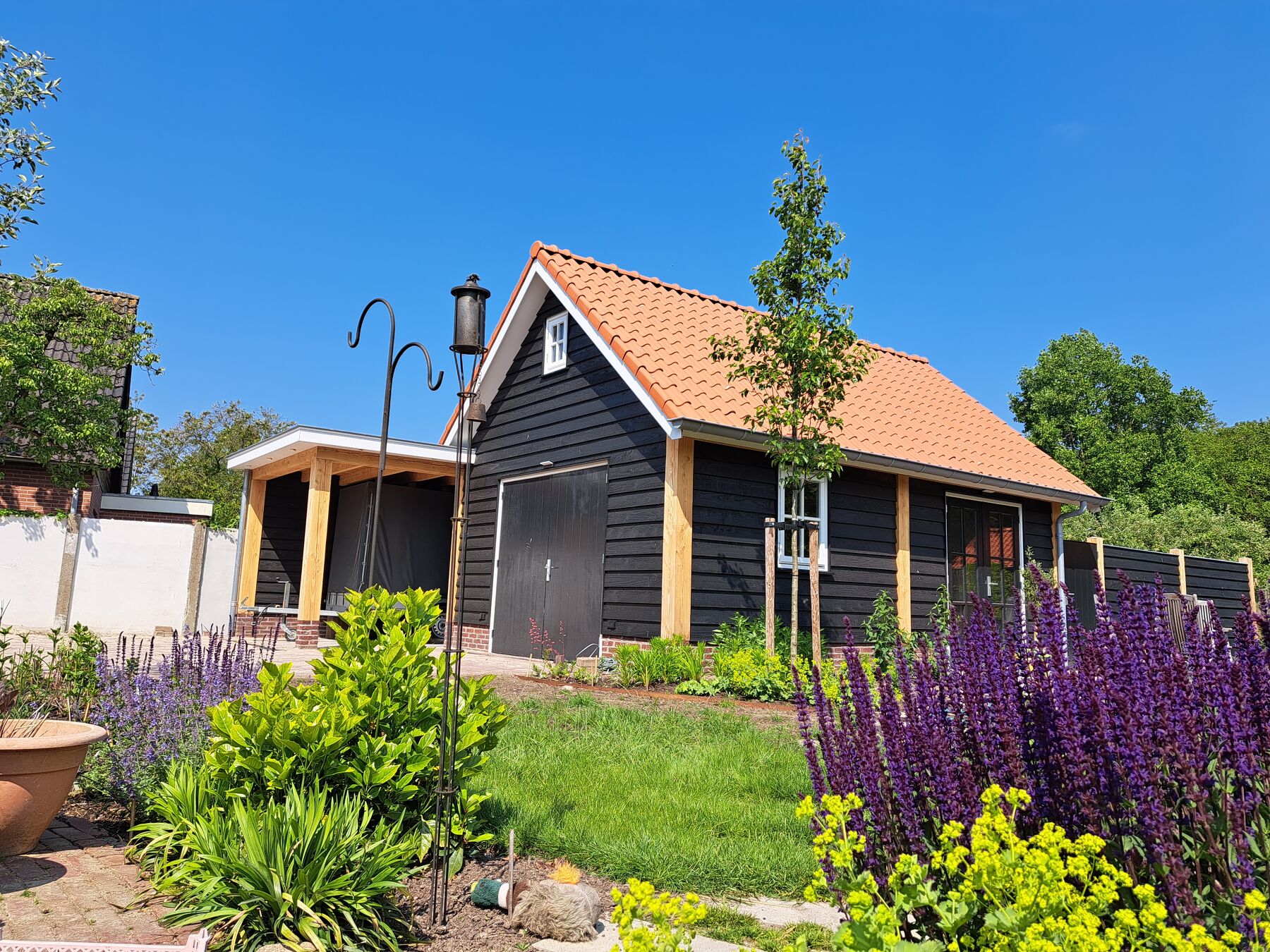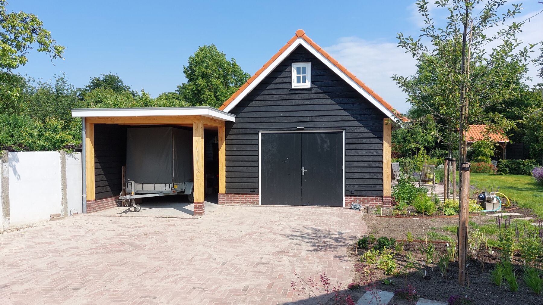 De carport is naadloos geïntegreerd met de schuur en biedt bescherming voor uw auto, aanhanger of camper. Dankzij de overkapping blijft uw voertuig droog en veilig, terwijl het geheel perfect aansluit op de rest van het erf of de tuin.