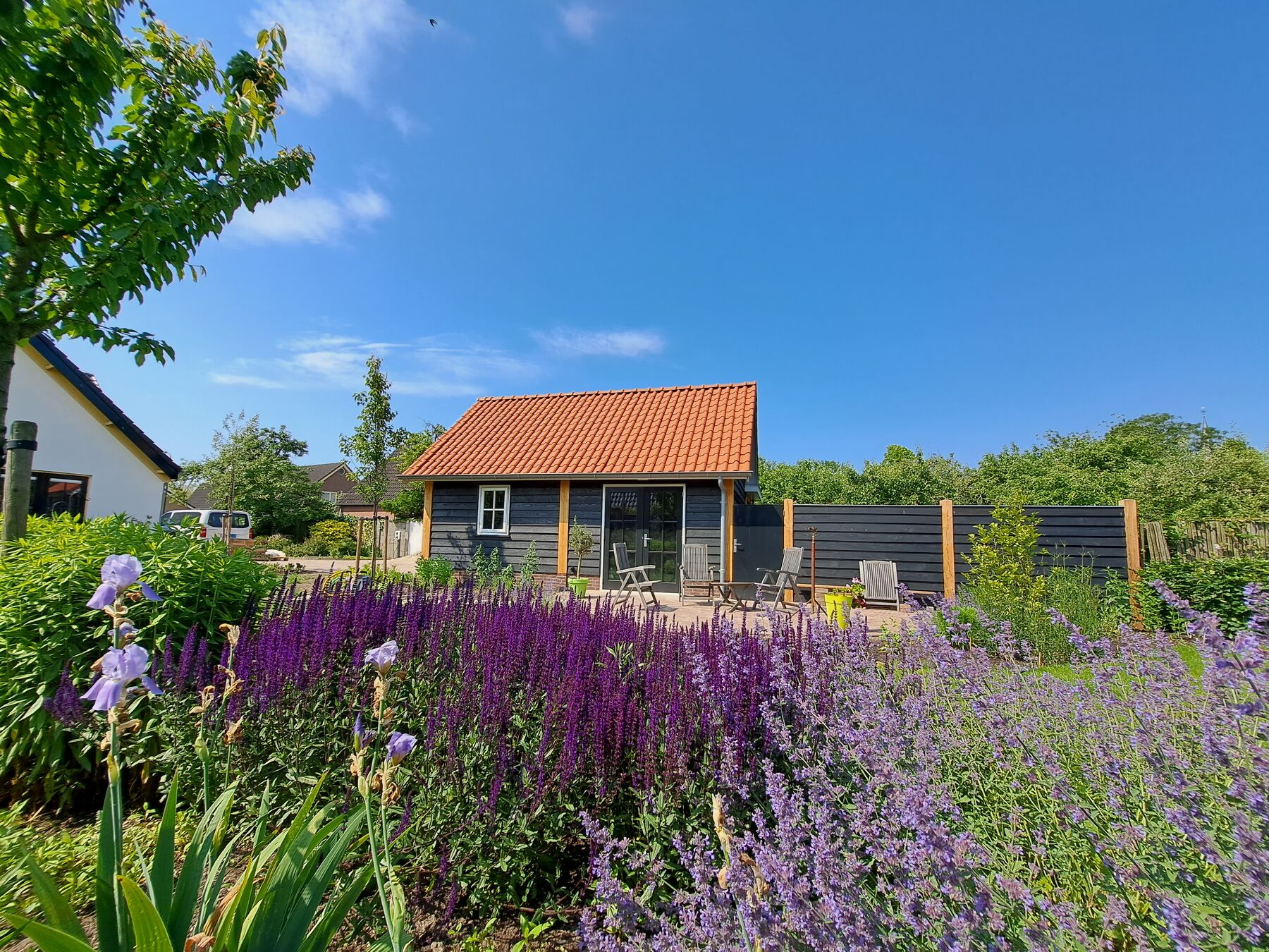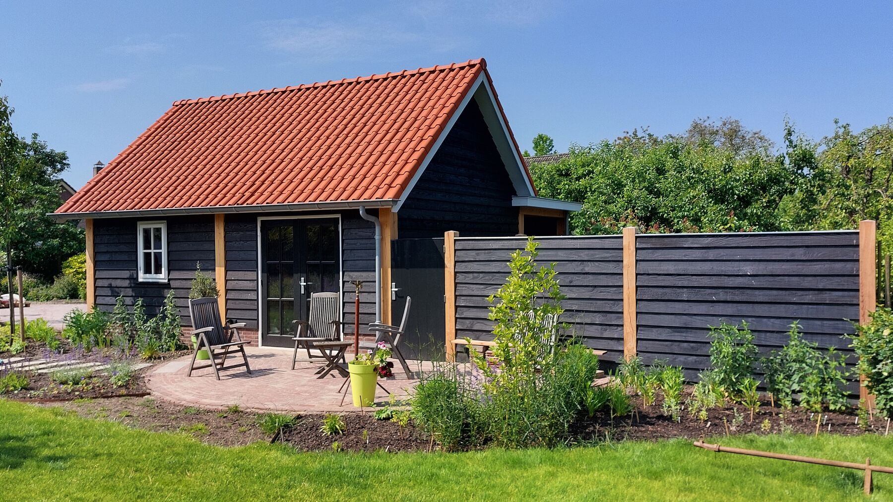 De houten schutting vormt de natuurlijke afronding van het project. In dezelfde stijl en kleur als de schuur en carport zorgt deze voor privacy en een mooi afgewerkt geheel. Zo ontstaat er rust en eenheid in de buitenruimte.